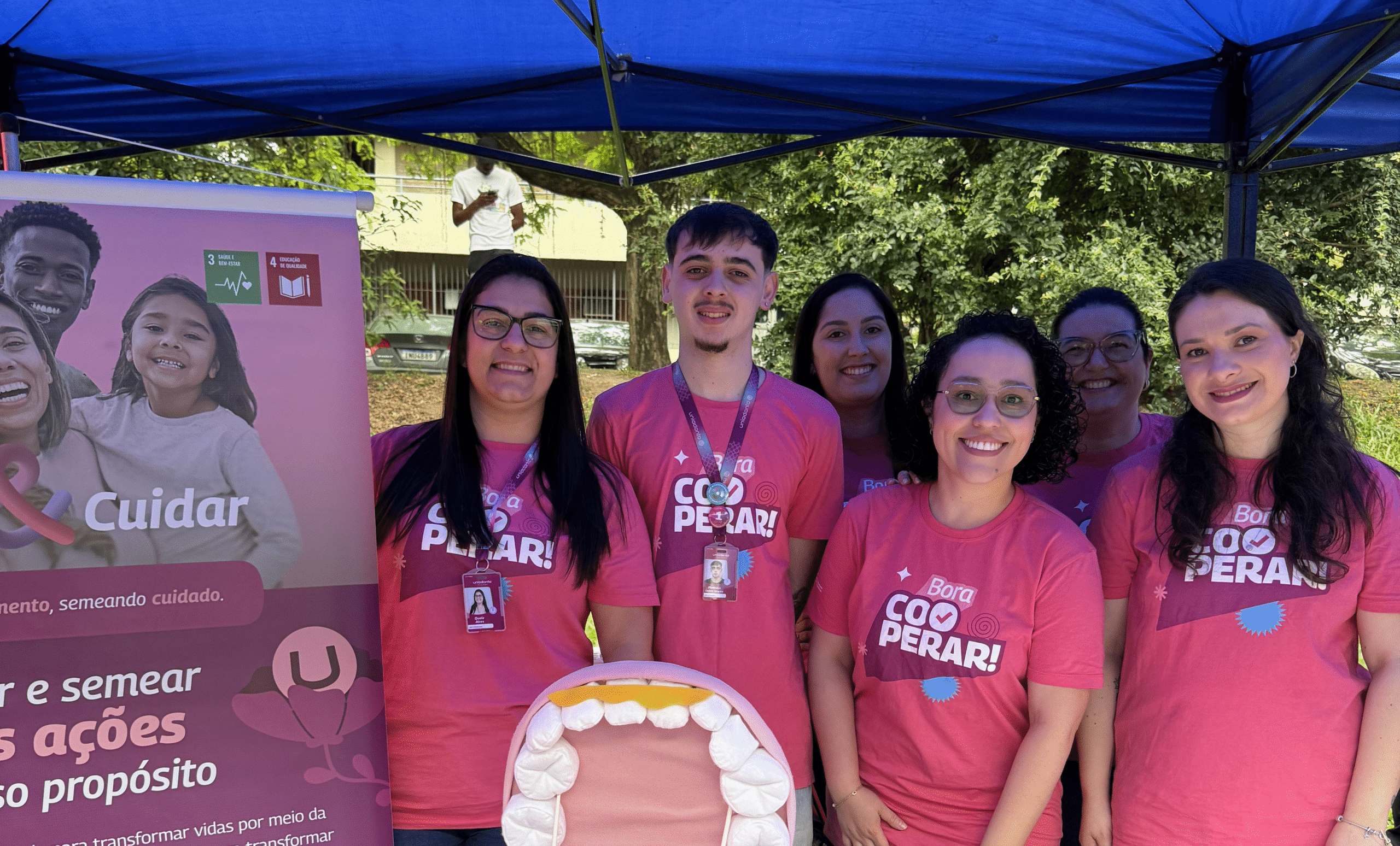 Além da atividade lúdica, a cooperativa também apresentou um banner informativo sobre o programa de saúde bucal e distribuiu brindes aos participantes, reforçando a mensagem de prevenção e cuidado com a saúde.