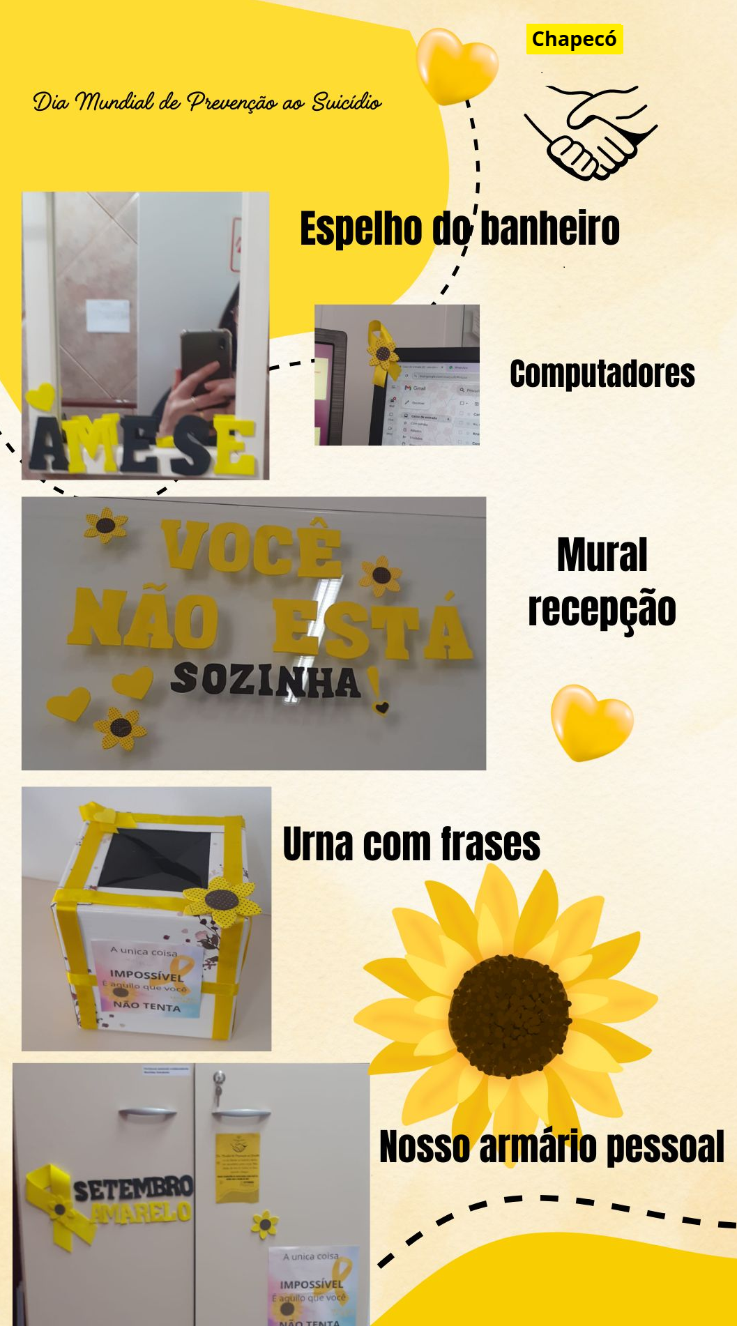 Além da palestra, a equipe de Designadas da CIPA preparou uma decoração especial nos escritórios e promoveu a ação “Caixinha do Bem”, uma iniciativa que incentivou gestos de gentileza, reflexão e valorização entre colegas. Dentro da caixinha, havia papéis com frases motivacionais, elogios sinceros e mensagens sobre saúde mental, que podiam ser lidos, guardados ou compartilhados com outras pessoas da equipe — uma maneira simples e afetiva de espalhar positividade e fortalecer os laços no ambiente de trabalho.